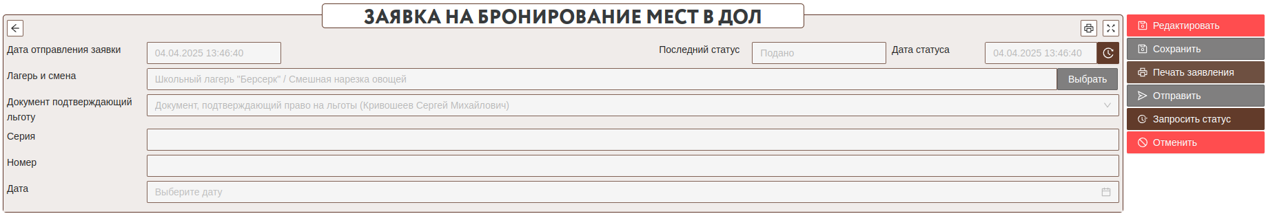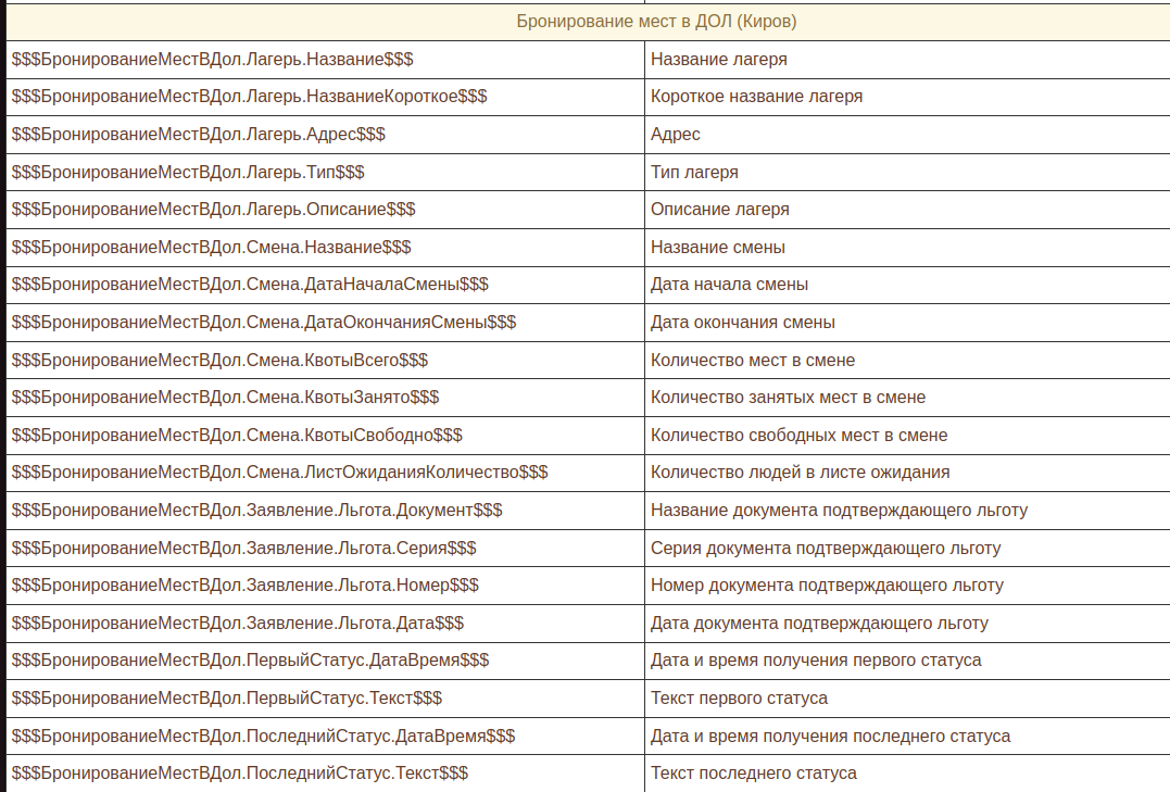 Для печати заявлений добавлены модульные метки, которые перечислены в разделе Бронирование мес в ДОЛ (Киров). Остальные метки нужно брать из общего списка для дел.