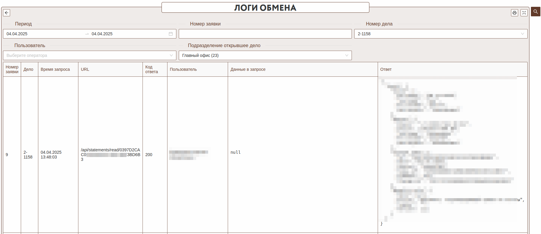На форме для просмотра логов обмена можно просмотреть информацию о всех запроса и ответах к сервису с учетом выбранных фильтров. Пустое значение в колонке Даные в запросе означает что запрос был отправлен через метод GET иначе через POST