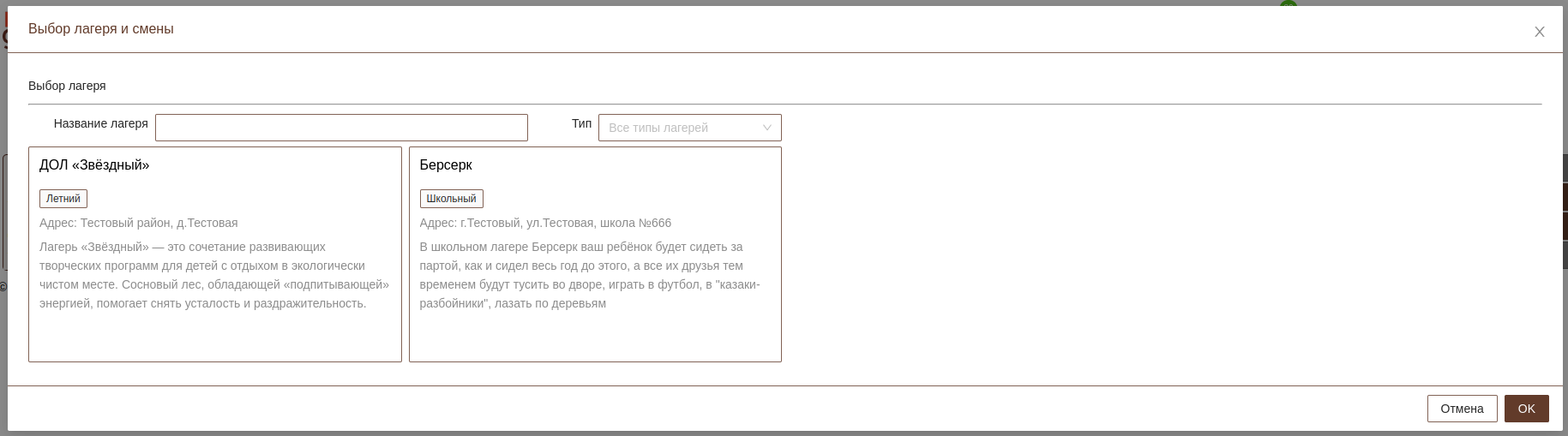 При выборе лагеря и смены будут произведены запросы к сервису. Первым происходит запрос списка лагерей. При необходимости оператор может воспользоваться фильтрами для поиска лагеря.