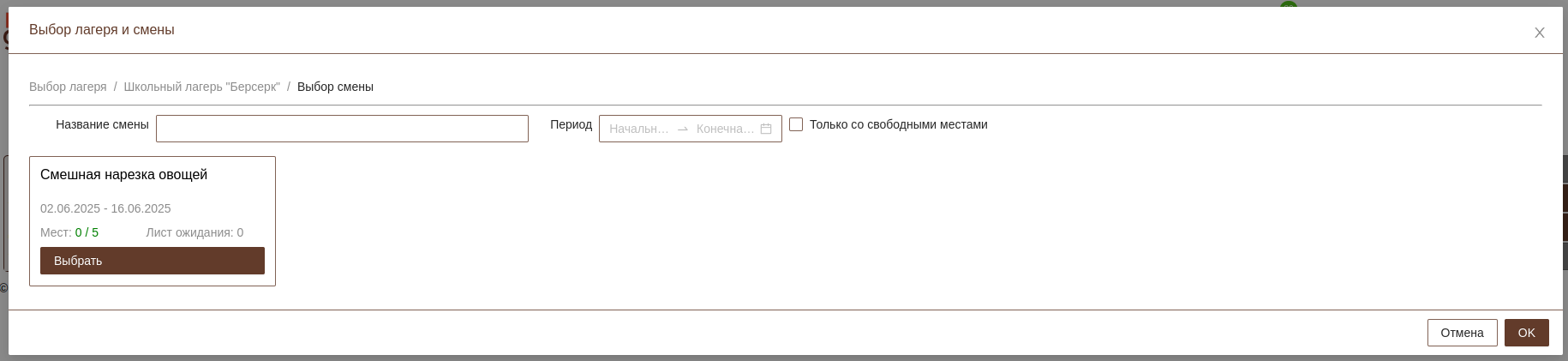 После выбора лагеря происходит запрос смен данного лагеря. При необходимости оператор может отфильтровать список смен.