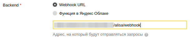 В качестве адреса хука необходимо указать фиксированный адрес на внешнем портале https://{portal.mfc}/alisa/webhook. Весь обмен с Марусей происходит через внешний портал. После поступления запроса на внешний портал он будет перенаправлен на mfc-core и обрабатываться через универсальный механизм чат ботов в МФЦ. Соответственно необходимо организовать сетевой доступ от внешнего портала до сервера mfc-core.