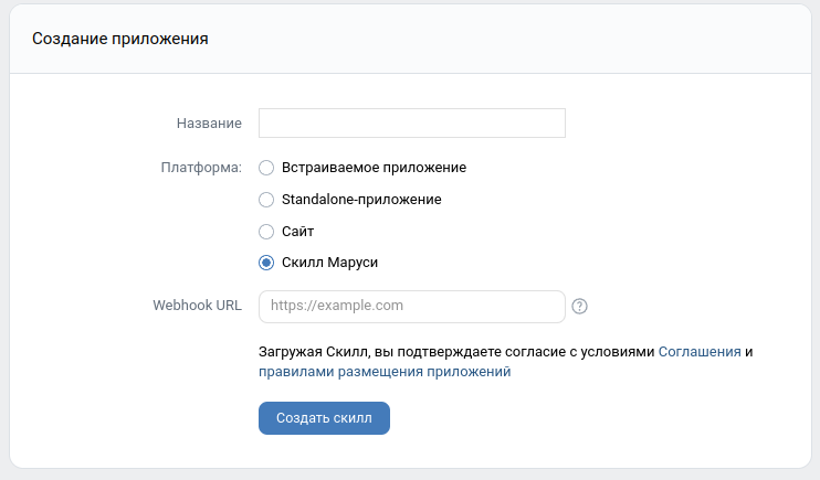Необходимо добавить новый скилл для Маруси по адресу https://vk.com/editapp?act=create. В качестве адреса хука необходимо указать фиксированный адрес на внешнем портале https://{portal.mfc}/marusia/webhook. Весь обмен с Марусей происходит через внешний портал. После поступления запроса на внешний портал он будет перенаправлен на mfc-core и обрабатываться через универсальный механизм чат ботов в МФЦ. Соответственно необходимо организовать сетевой доступ от внешнего портала до сервера mfc-core.