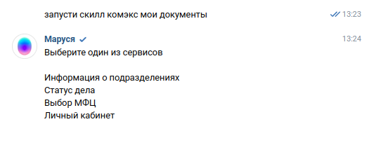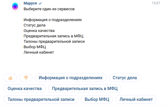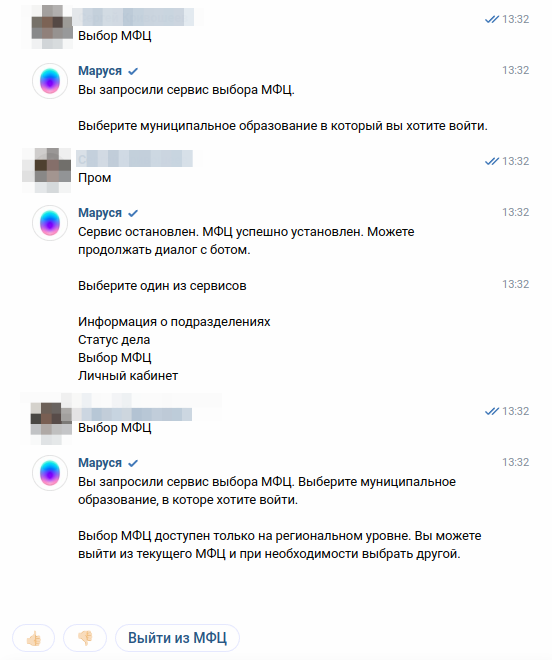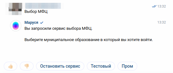 Если Маруся используется на децентрализованных системах доступен сервис выбора МФЦ. При этом пользователю необходимо сказать название муниципального образования для переключения на другой сервер МФЦ.