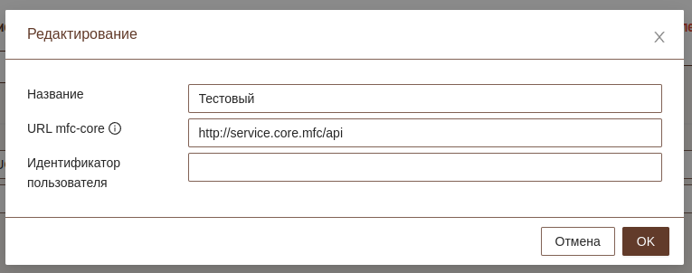 Для добавления необходимо указать название, которое пользователь должен назвать для выбора. Название необходимо указывать в соответствии с муниципальными образованиями, где установлен сервер МФЦ. В поле URL mfc-core необходимо указать адрес сервера mfc-core в соответствии с форматом поля Адрес сервера с API из общих настроек МФЦ.