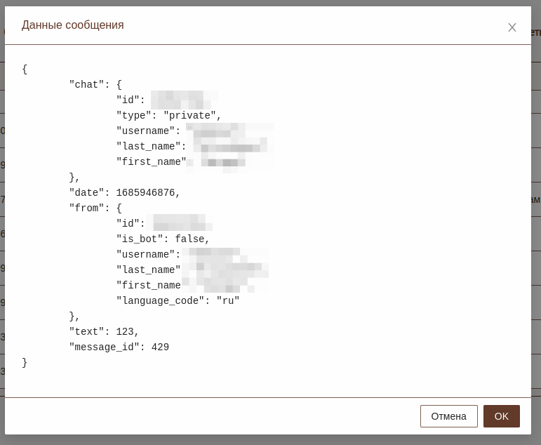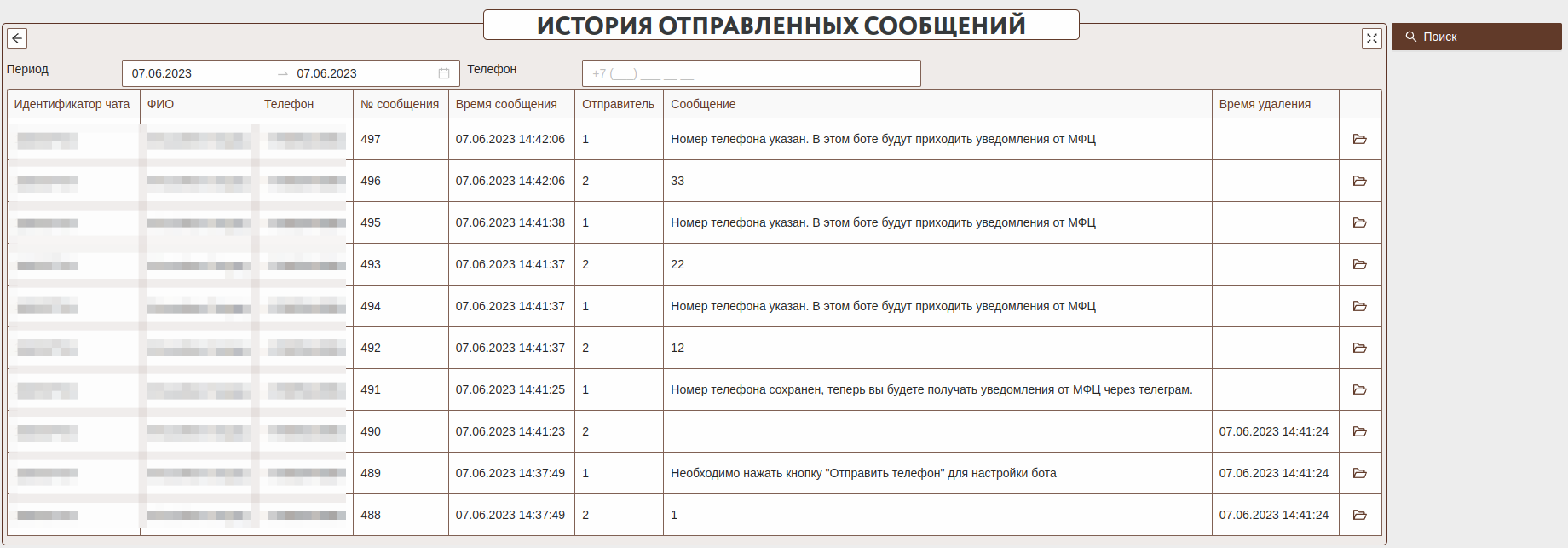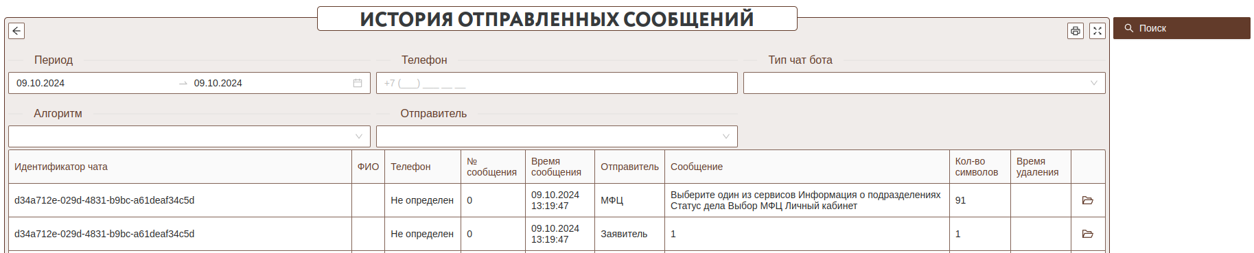 Данная форма отображает информацию о всех сообщениях отправленных ботом и заявителями. Данная форма позволяет анализировать историю взаимодействия с ботом. Время удаления проставляется если на стороне бота были удалены сообщения. Бот удаляет все сообщения до момента получения телефона, т.к. эта информация является технической и не относится к дальнейшим уведомлениям заявителя.