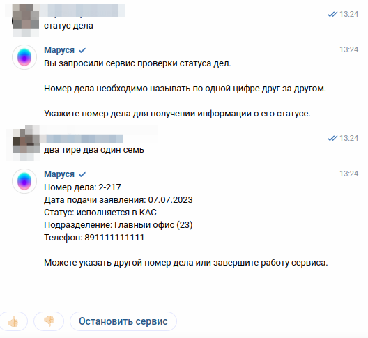 Если данный сервис будет вызван с учетом авторизации, то заявителю будут показаны кнопки со списком всех его дел. При этом пользователь может как нажать кнопку, так и назвать номер дела голосом.