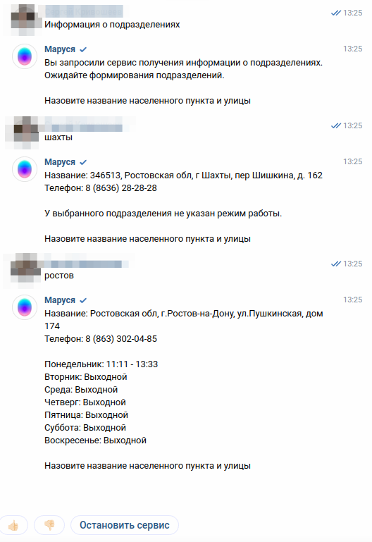При запросе сервиса "информация о подразделениях" система проанализирует через какое устройство пришел запрос. Для голосовых платформ бот предложит назвать населенный пункт и улицу для поиска подразделения. При запросе через классические чат боты будет показан список офисов с возможностью выбора по номеру офиса из списка.