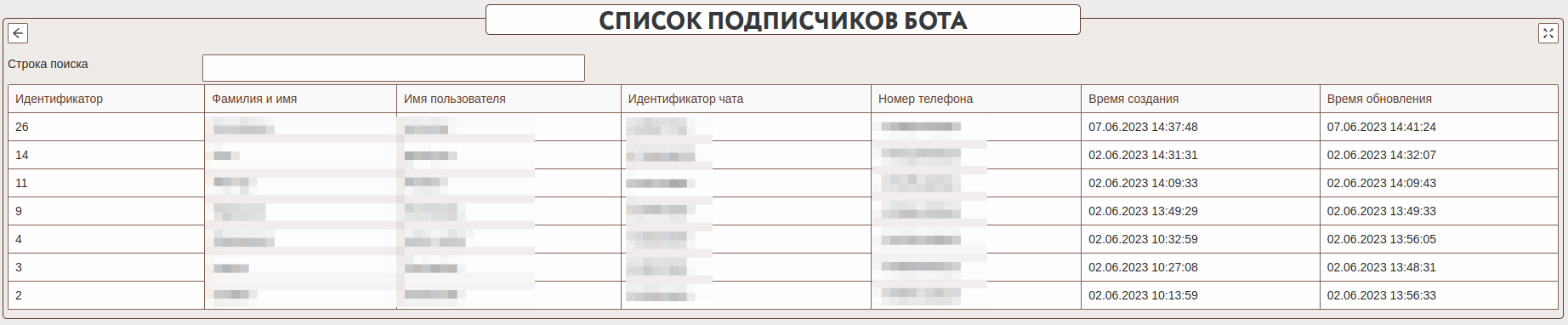 Данная форма позволяет просмотреть все чаты заявителей, которые подписались на работу с ботом. Если не указаны номера телефон, то данные заявители не получат сообщения от МФЦ через механизм уведомлений.