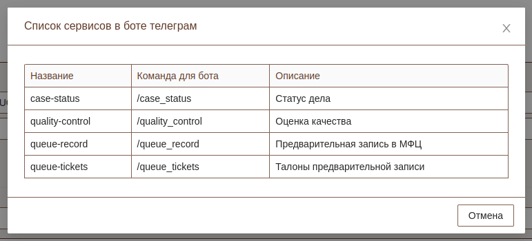В т.ч. можно добавить команды, которые запустят соответствующий сервис из списка доступных сервисов. Для просмотра списка всех сервисов доступных в данный момент в настройках бота телеграм необходимо нажать кнопку "Список сервисов"