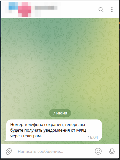 Когда данные будут обработаны придет уведомление в чат с заявителем. Далее все уведомления с алгоритмом "Отправление сообщений через телеграм бота" будут приходить в этот чат.