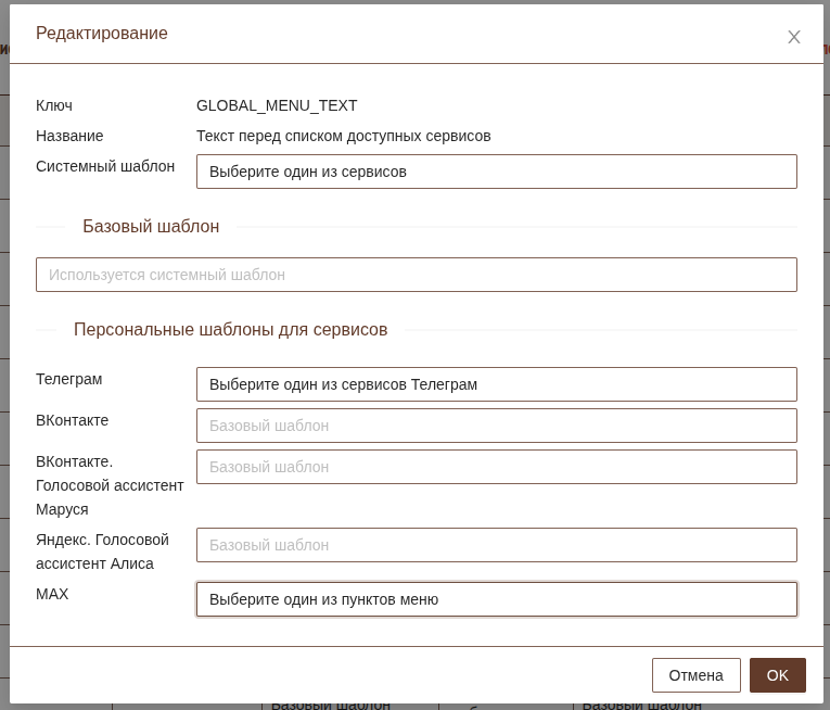 При указании базового шаблона текст будет изменен для всех чат ботов, которые работают в системе.