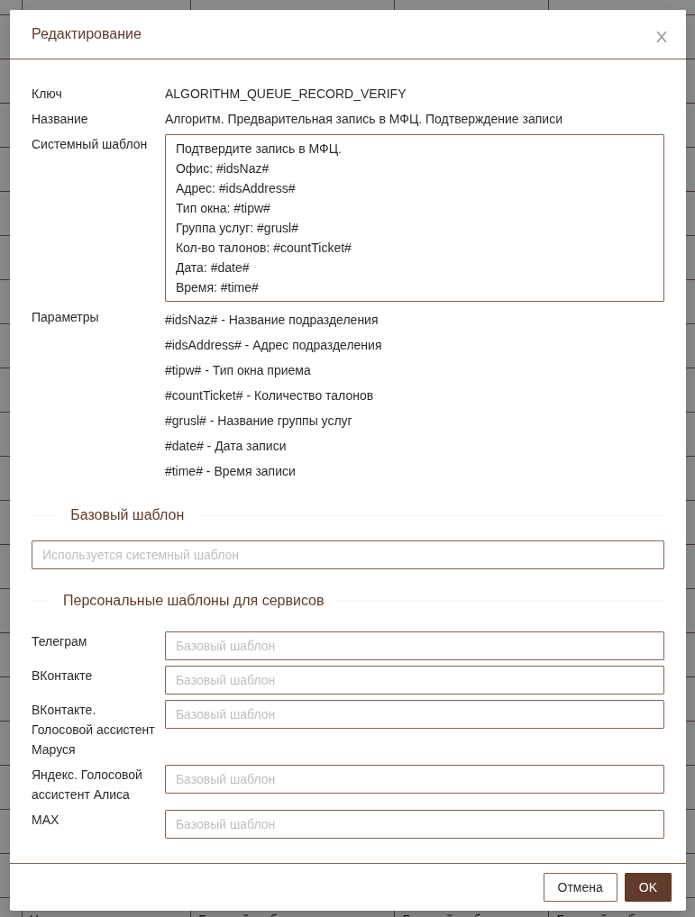 При редактировании шаблона можно увидеть Ключ и название шаблона. В поле "системный шаблон" будет показан текст шаблона, который отправляется по умолчанию.