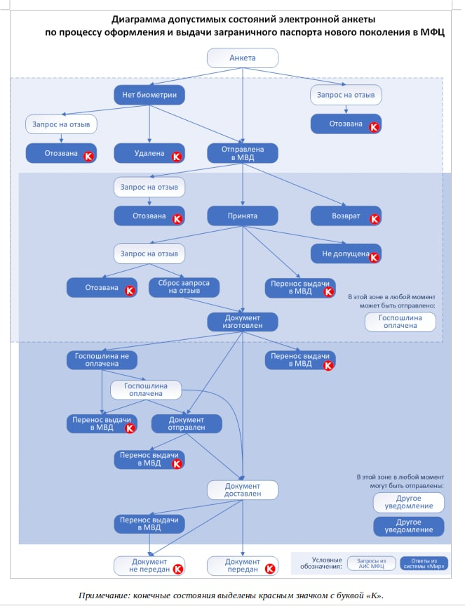 На данной схеме белые блоки - это статусы инициируемые МФЦ, а синие - МВД. На ней показан жизненный цикл анкеты в Системе МИР.