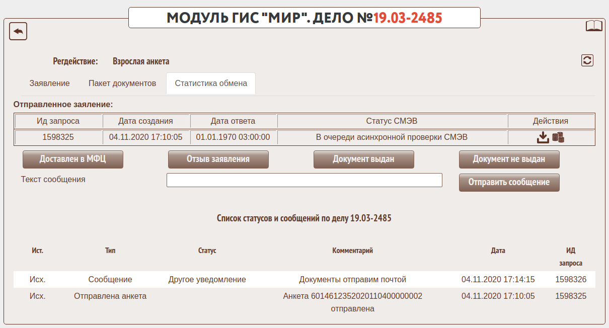 Также на данной вкладке можно отправить запрос на отзыв заявления (по желанию заявителя), оповещение о факте успешной доставки изготовленного документа в МФЦ, оповещение об успешной или неуспешной выдаче документа в МФЦ, произвольное сообщение, для отправлено в ОТУ МВД, которое занимается выпуском паспорта.