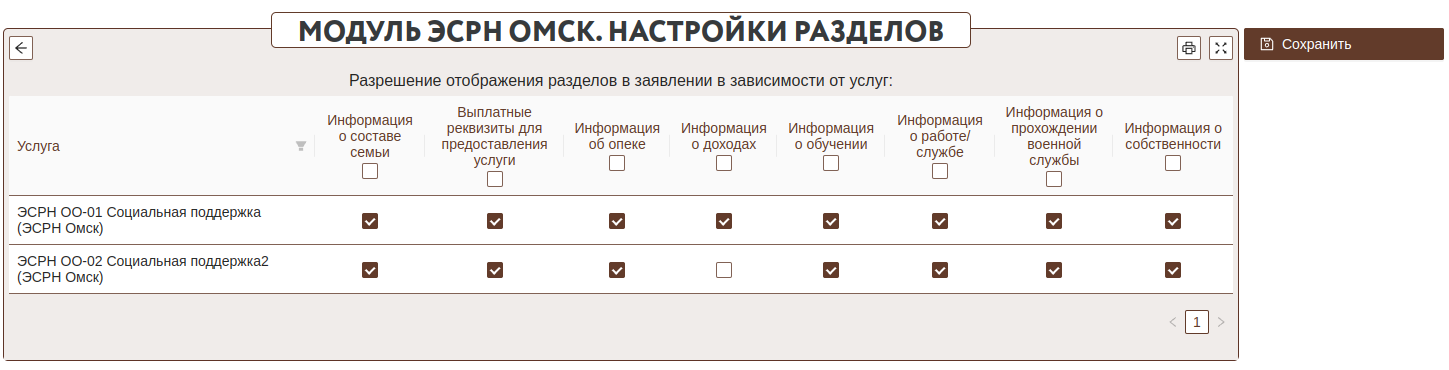 Некоторые разделы являются необязательными в зависимости от специфики предоставляемых услуг. На форме "Настройки разделов" (Меню: Модули-->ЭСРН Омск-->Настройки разделов) нужно указать разрешенные для услуги разделы: