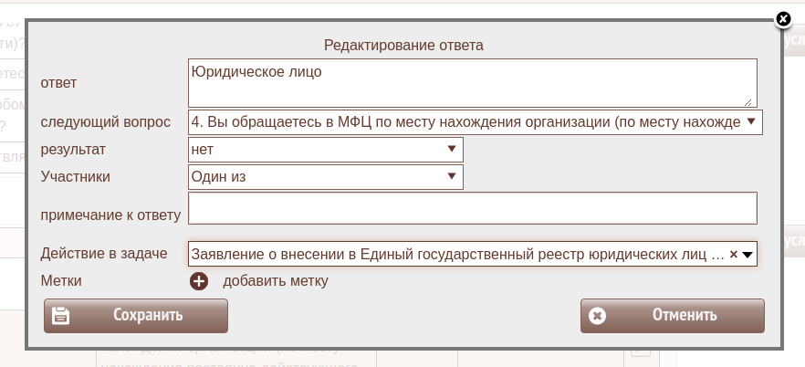 Так как формат обмена данными с ФНС подразуметает несколько видов регистрационных действий, то необходимо указать какое именно регдействие подразумевается в каждом конкретном случае. Для этого необходимо на определенных ответах опросника указать какое именно регдействие, соответствует этим ответам.