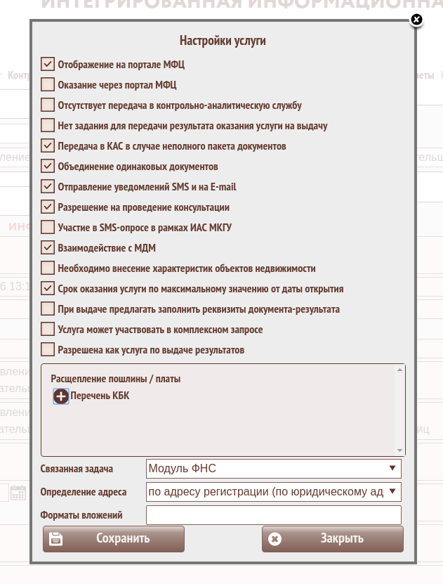 Для услуг, при оказании которых необходимо использовать данный модуль, надо в паспорте услуги, в пункте "Настройки услуги" указать связанную задачу "Модуль ФНС"