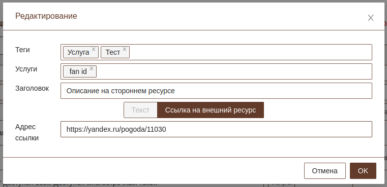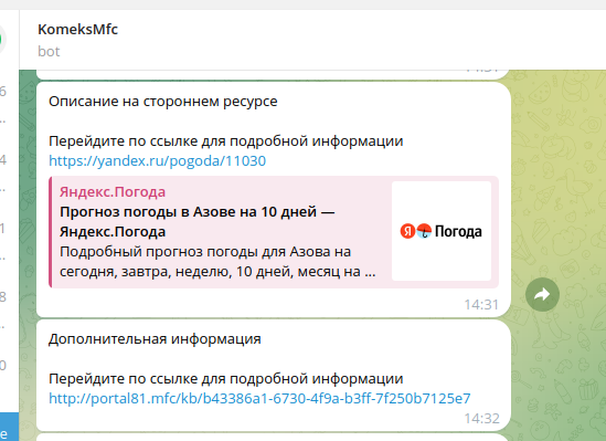 Если указано текстовое описание будет сформирована ссылка на внешний портал МФЦ, при переходе на которую, заявитель увидит заголовок и описание записи. Если указана внешняя ссылка, то она будет вставлена сразу в сообщение без изменений.
