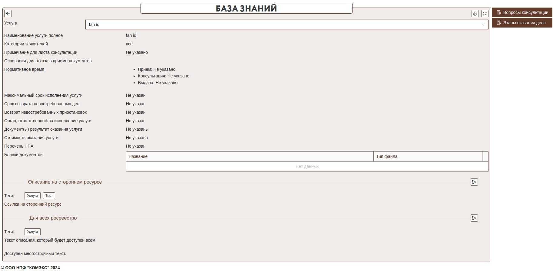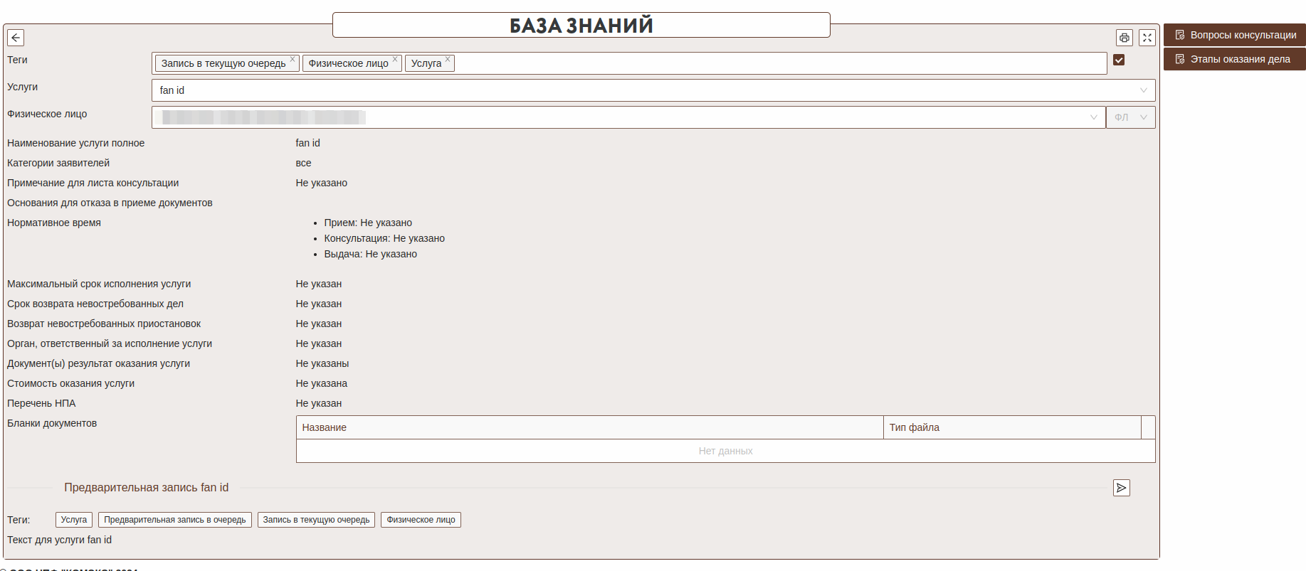 Формы карточки дела у оператора и кас, а также форма выдачи пакетов документов по выбранному делу предустанавливают услугу и при переходе в базу знаний сразу откроется информация по ней.