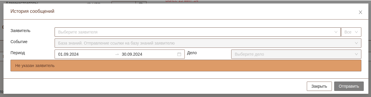 Можно регулировать период просмотра истории сообщений при выборе только заявителя в качестве фильтра. Если отправление уведомлений будет происходить с учетом дела, будет проигнорирован период и отображены все сообщений по выбранному делу и заявителю.