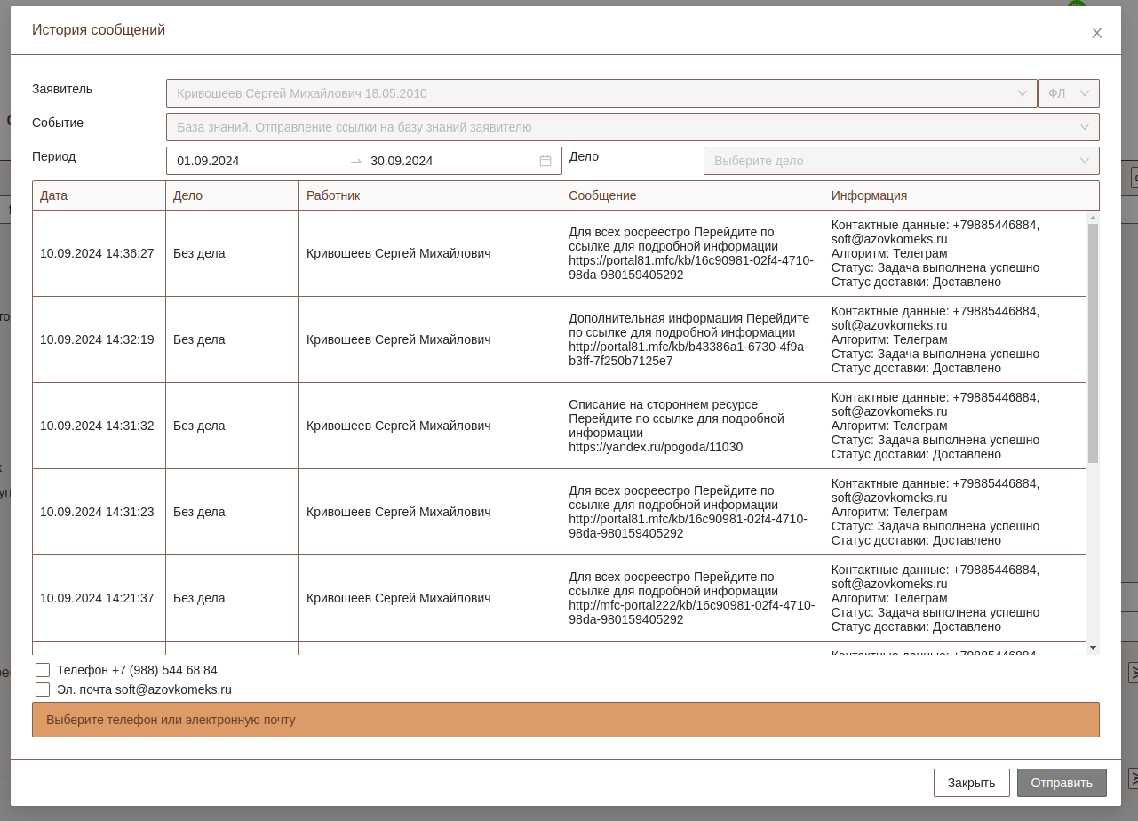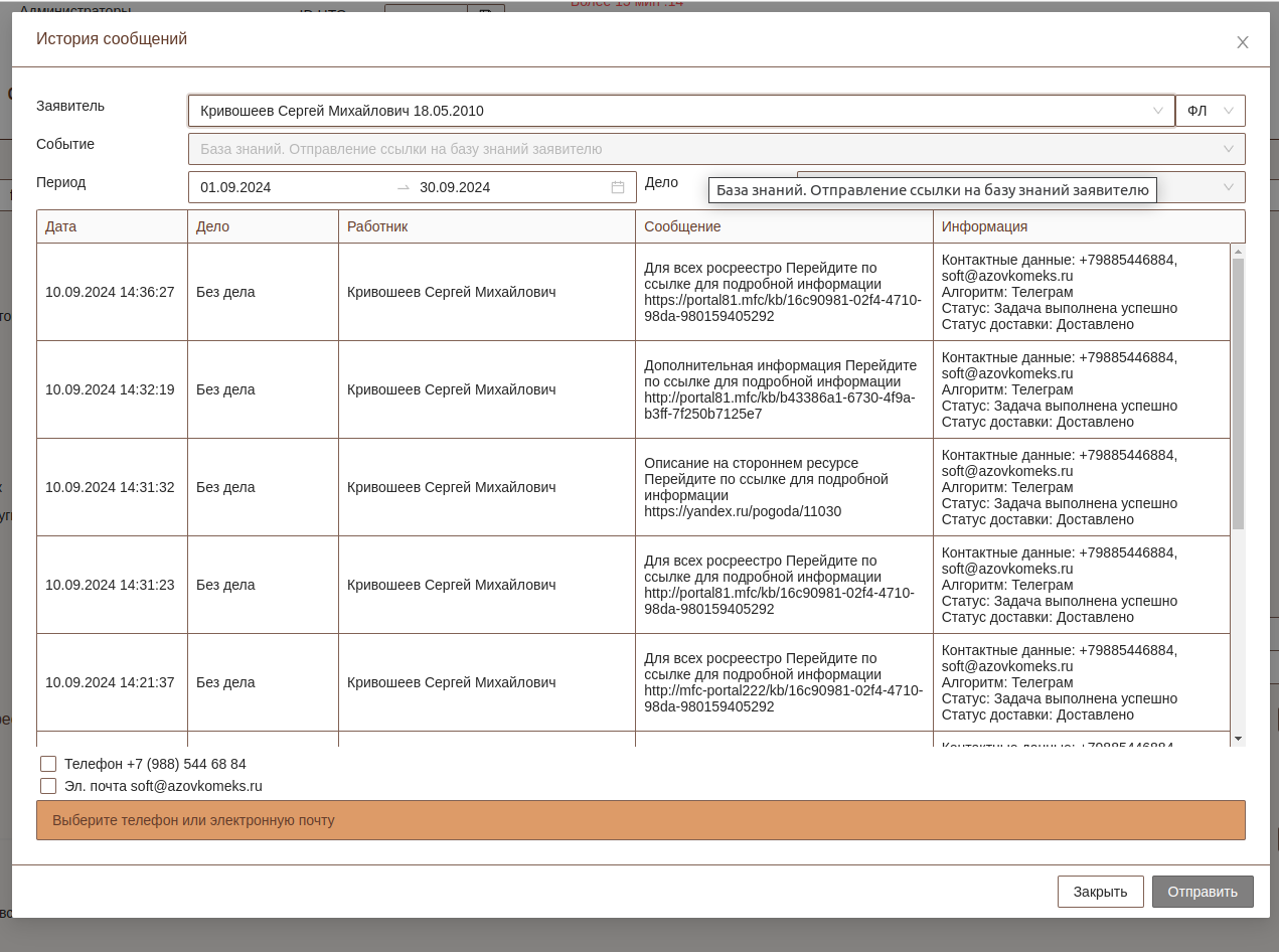 Для отправления уведомления необходимо выбрать телефон и/или электронную почту. Текст сообщение автоматически будет сформировано с учетом выбранной записи из базы знаний. При необходимости оператор может скорректировать отправляемый текст.