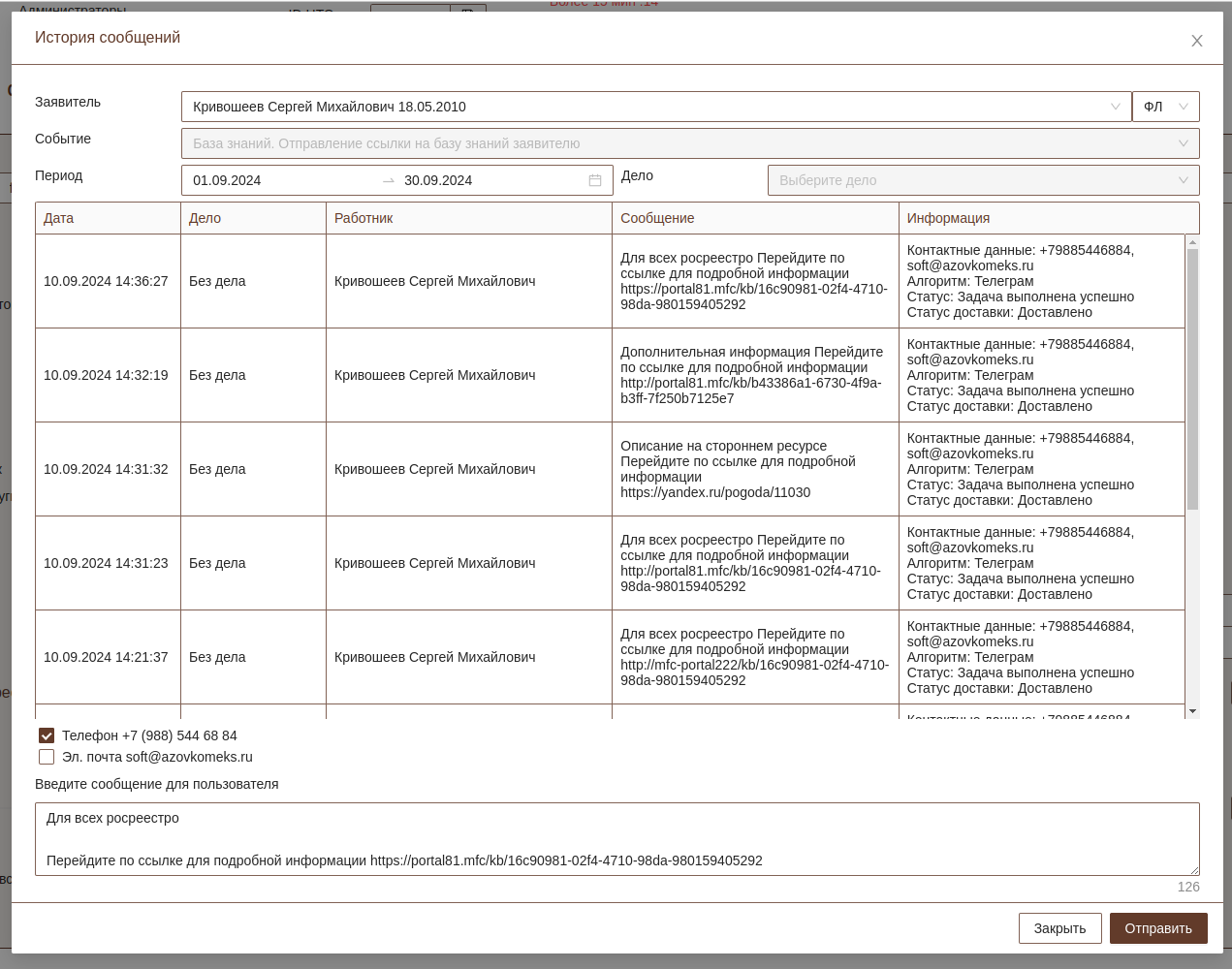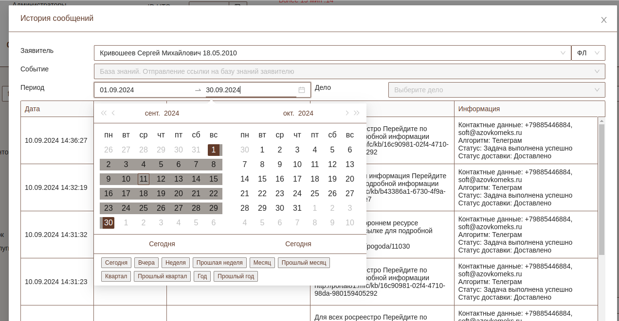 При выборе заявителя будет доступна история отправленных сообщений за выбранный период. При необходимости можно изменить период для просмотра истории отправленных уведомлений.