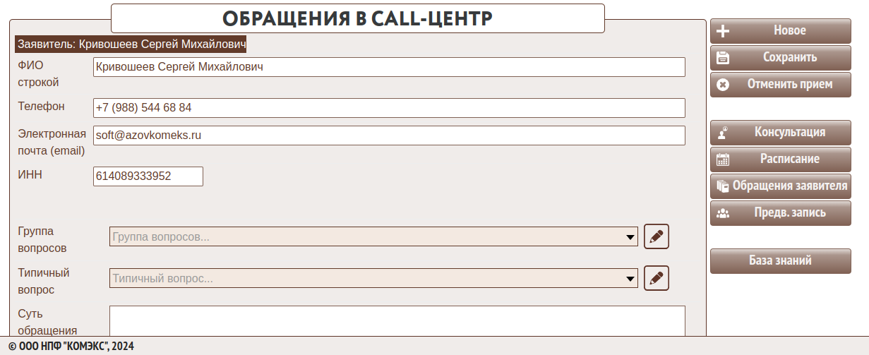 Если карточка заявителя будет выбрана из базы МФЦ (определен идентификатор карточки заявителя) появится кнопка "База знаний" при ее нажатии произойдет переход на форму просмотра базы знаний и заявитель будет предвыбран в соответствии с выбранной карточкой.
