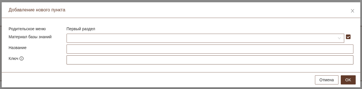 Для добавления ссылки на материал базы знаний необходимо выбрать его из списка. При выборе из списка автоматически будут добавлены название и ключ. При необходимости название в меню базы знаний можно изменить.