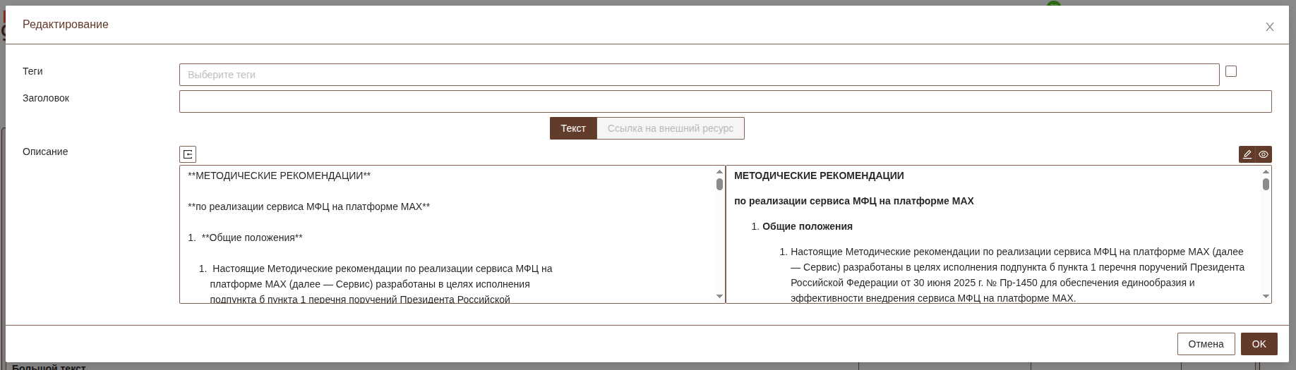 Описание поддерживает текст в формате Markdown. При необходимости можно импортировать текст из файлов *.docx. Для корректной работы необходимо установить программу pandoc на сервере mfc-core. Возможно не все документы будут корректно импортироваться в систему, рекомендуем минимизировать форматирование документов перед импортированием.