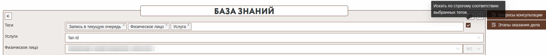 По умолчанию при просмотре базы знаний будет включен "строгий" режим поиска. "Строгий" режим будет искать записи в базе знаний только при условии совпадения всех выбранных тегов. При необходимости его можно отключить и тогда будут показаны все записи которые удовлетворяют выбранным тегам и значениям в дополнительных фильтрах.