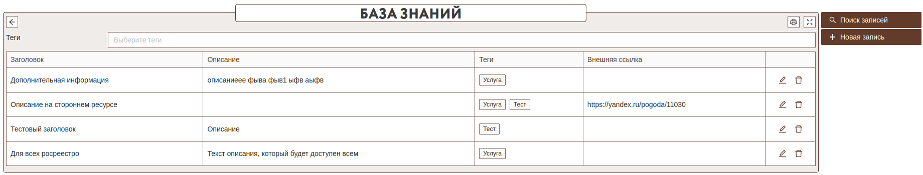 Данная форма позволяет редактировать информацию, находящуюся в базе знаний. Информация привязывается к тегам. Список тегов определяется разработчиками и позволяет группировать записи по разным типам информации.