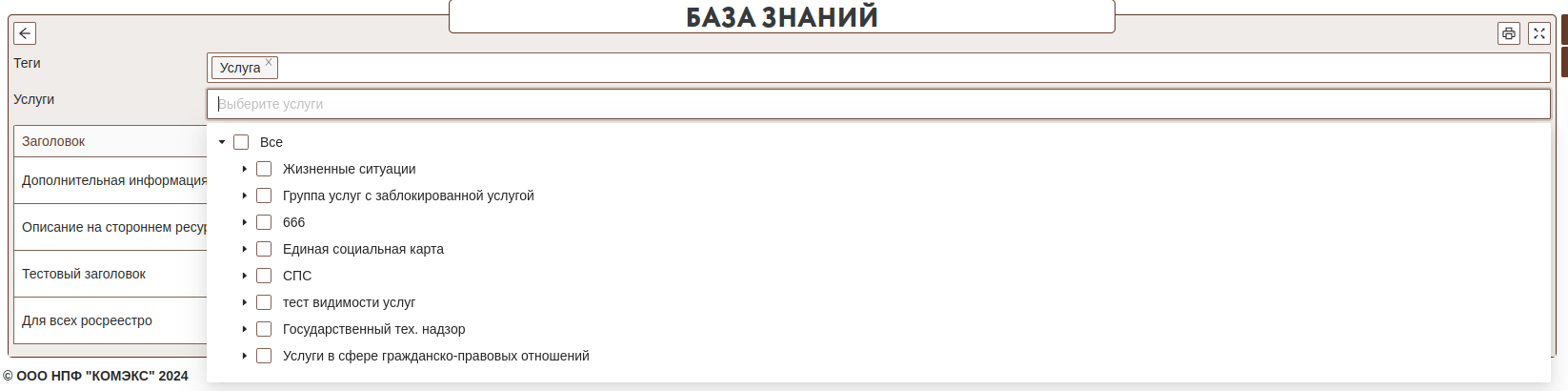 При переходе в базу знаний будут предустановлен список тегов и значения для дополнительных фильтров.