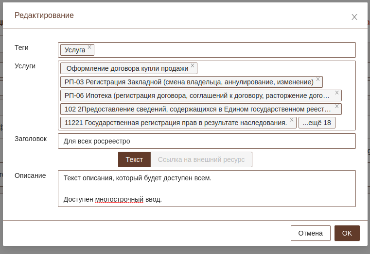 При редактировании или добавлении записей необходимо указать теги и дополнительные параметры к ним при необходимости. Каждая запись должна содержать текстовое описание или ссылку на внешний ресурс.