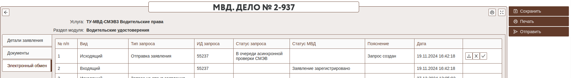 - ВАЖНО!!! при выдаче нового ВУ заявителю обязательно нужно отправить в ГИБДД запрос, сообщающий ведомству, что документ выдан. Если этого не сделать - новые ВУ будут НЕДЕСТВИТЕЛЬНЫМИ. Отправить этот запрос можно из вкладки "Электронный обмен" модуля или же из статистики обмена по модулю МВД СМЭВ3.