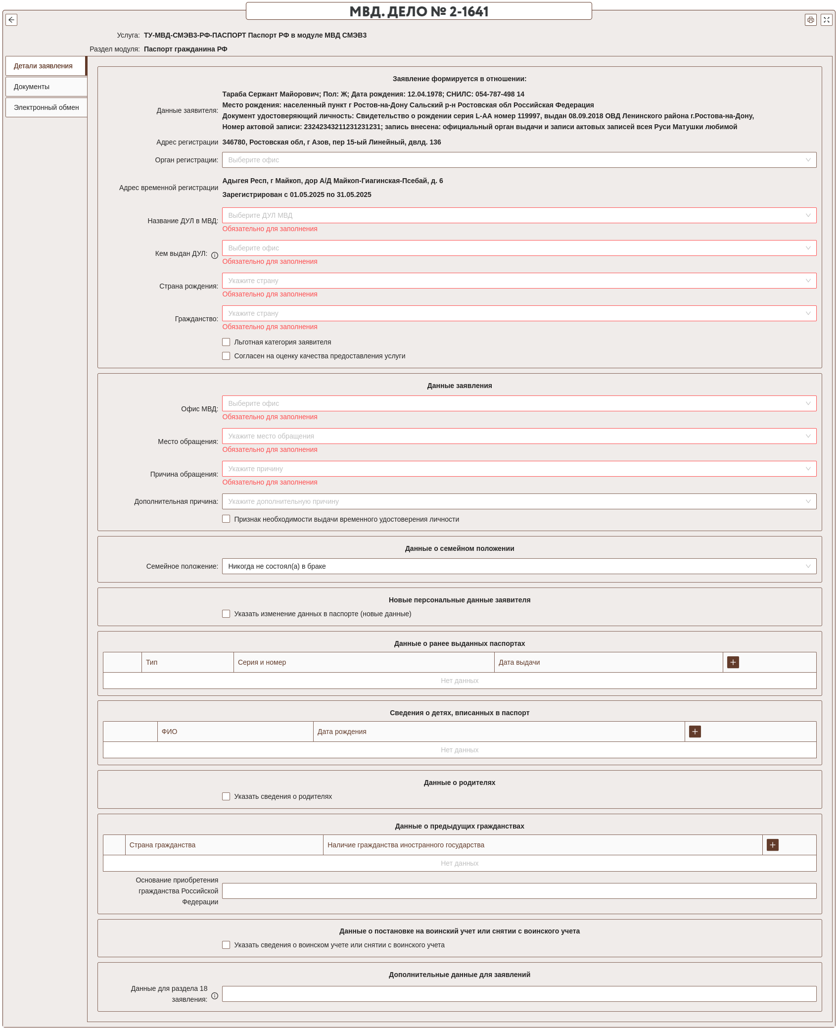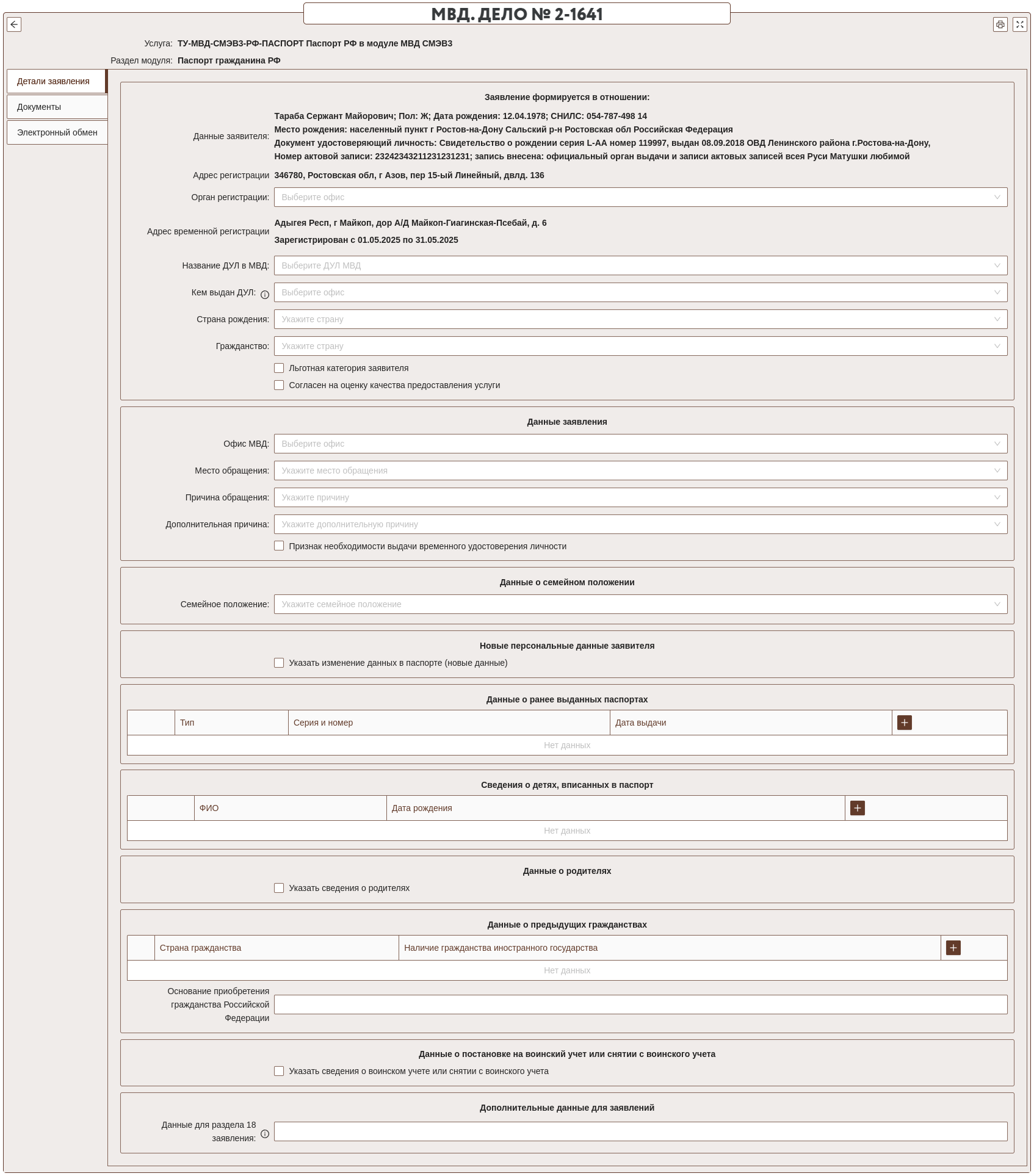 Ниже представлен пример основной экранной формы раздела Паспорт РФ: