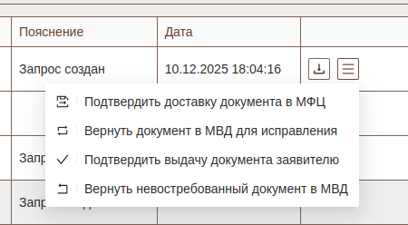 ВАЖНО!!! В соответствии с требованиями МВД в части соблюдения статусной модели заявки, МФЦ обязаны оповещать МВД о действиях с изготовленным паспортом. МФЦ обязано уведомить МВД о том что документ доставлен в МФЦ, отправив соответствующий запрос. Так же необходимо уведомить МВД о выдаче или возврате документа. При этом, нельзя отправить запрос о выдаче документа, если не отправляли запрос о доставки документа в МФЦ. Указанные выше запросы можно сформировать нажав на кнопку создания запросов на соответствующей строке таблицы электронного обмена.