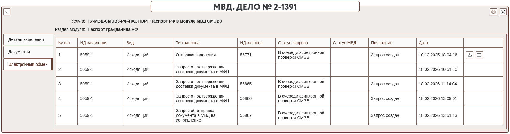 при отправке запроса в ведомство будет сформирован электронный пакет докуметов и заявления для отправки через СМЭВ3. При успешном создании запроса, в таблице раздела "Электронный обмен" появится соответствующая строка. В этой же таблице будут отобраться все входящие и исходящие статусы в рамках этого дела.