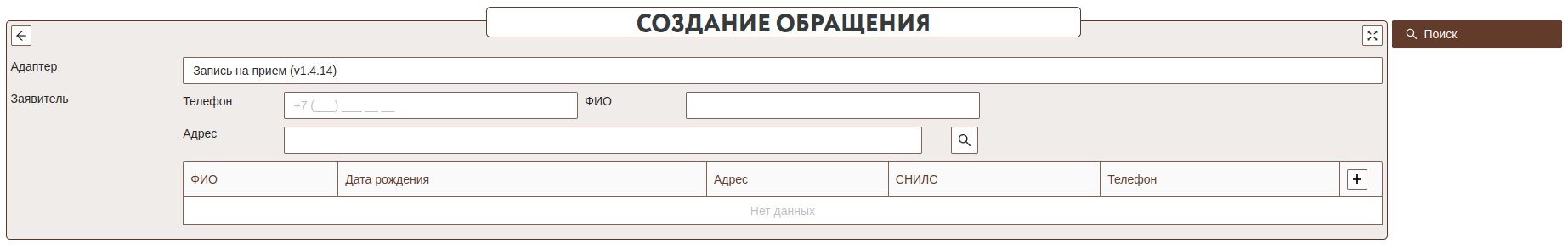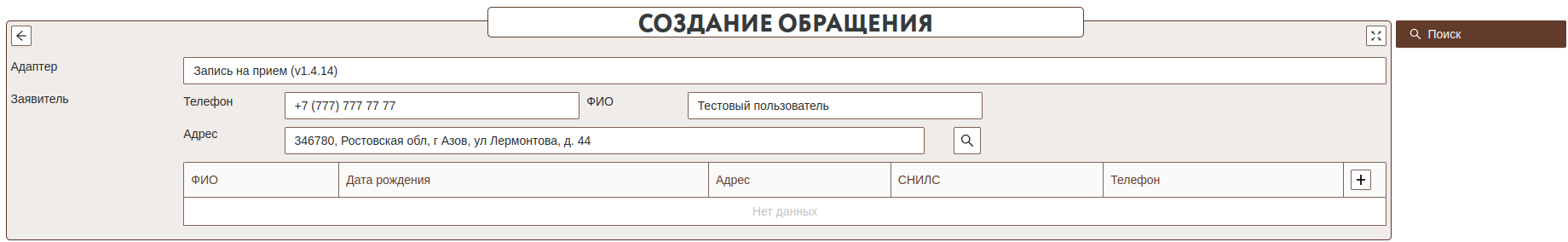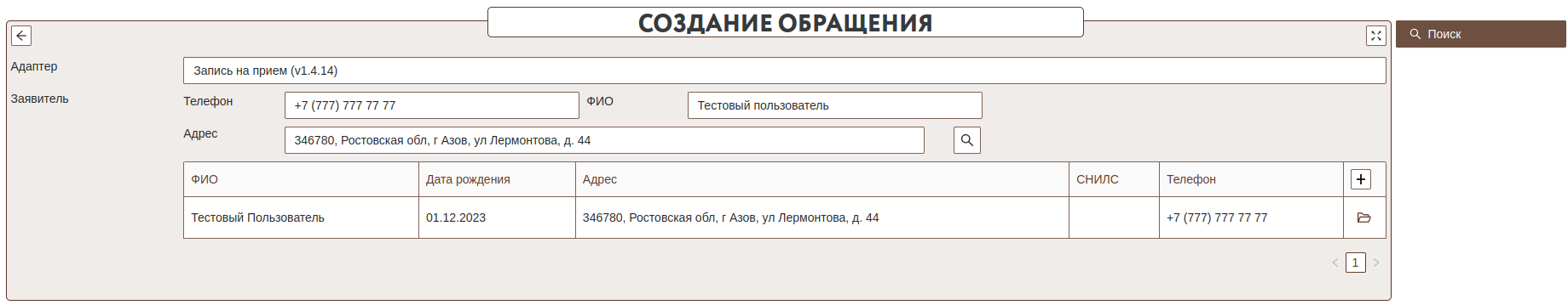 После создания пользователя при повторном поиске будет доступен заявитель для создания обращения.