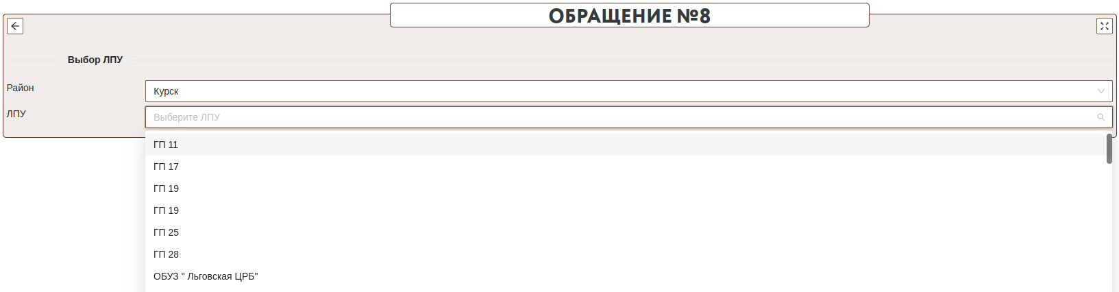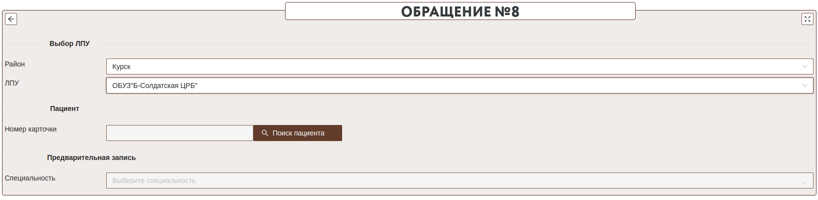 Когда выбрано ЛПУ открывается возможность поиска пациента и записи на прием.