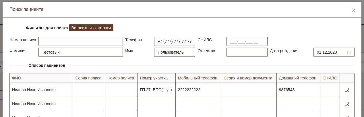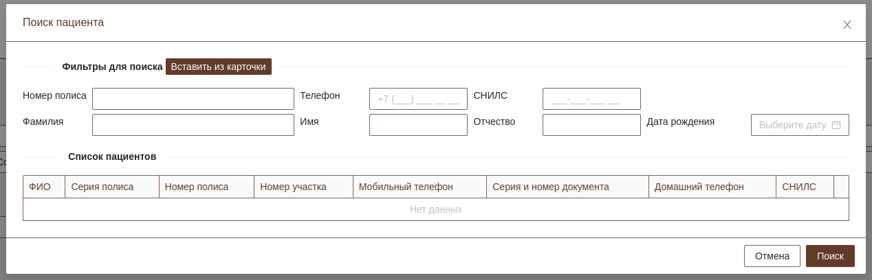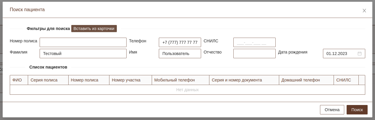 Поиск пациента происходит среди реальных пациентов ЛПУ через API Нетрика медицина. Для уточнения доступны фильтры для поиска. При необходимости можно вставить данные из карточки заявителя. Для этого необходимо нажать кнопку "Вставить из карточки"