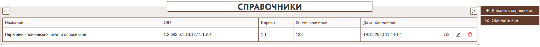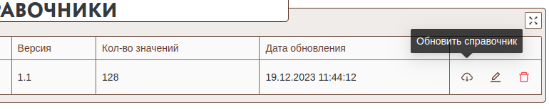 После добавления справочника необходимо загрузить его значения. Можно загрузить значения отдельного справочника или всех сразу. После успешной загрузки отобразится количество значений в справочнике и дата послебднего обновления.