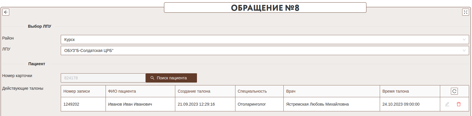 После выбора пациента автоматически отправится запрос для поиска действующих талонов записи в ЛПУ. При необходимости оператор может отменить действующий талон.