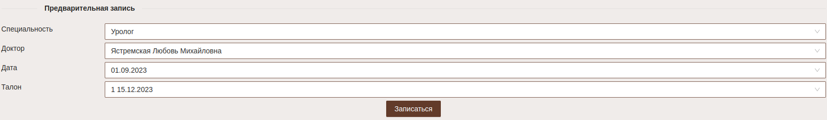 Для записи на прием необходимо указать специальность, доктора, дату и талон для записи. Список доступных дат запрашивается на 3 месяца вперед от текущей даты.