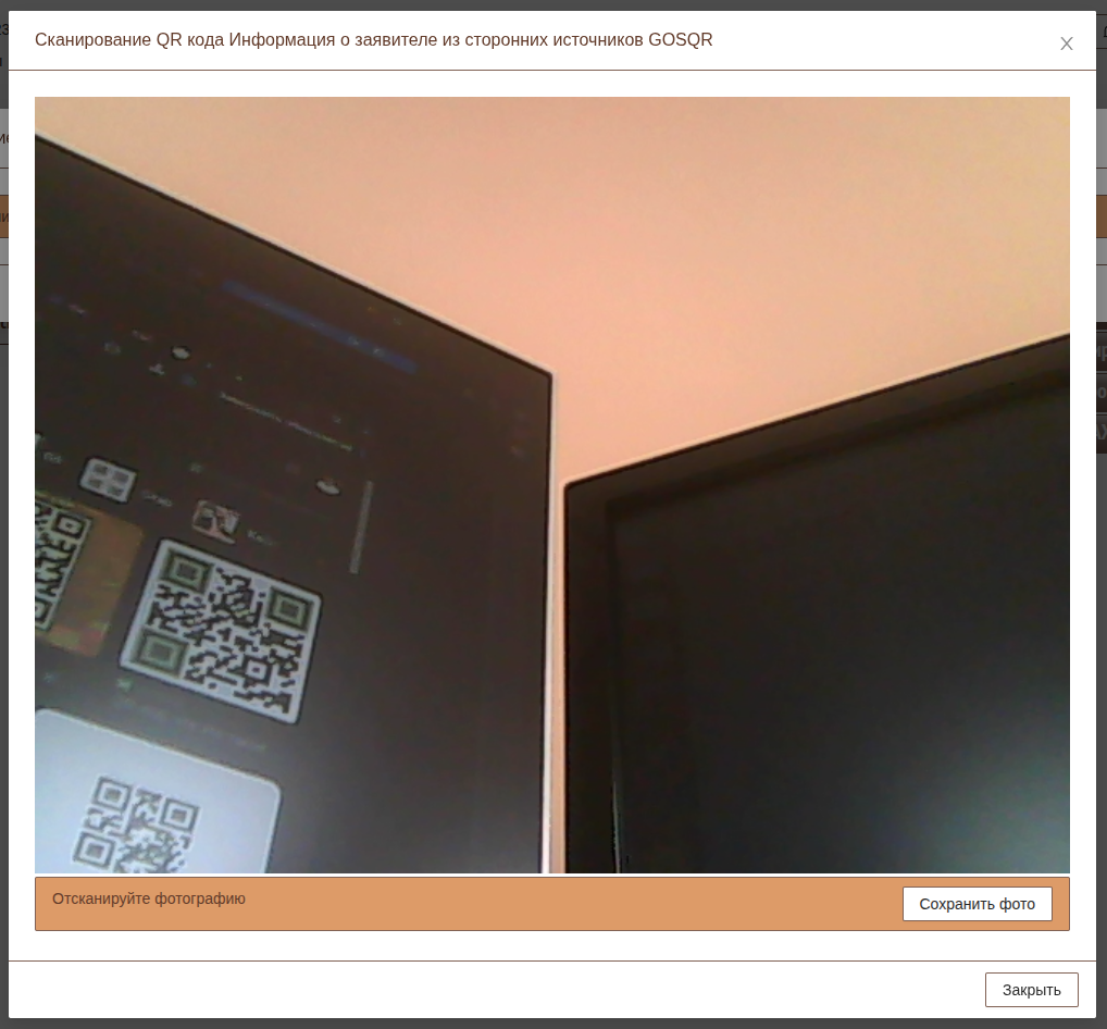 После сканирования QR кода система попросит сохранить фотографию экрана. Необходимо сохранить фотографию заявителя с экрана телефона через нажатие кнопки "Сохранить фото". При нажатии на кнопку изображение будет сохранено в системе и сформируется запрос в СМЭВ 3/4.