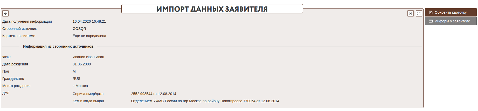 После получения информации будет создана карточка с данными заявителя из сторонних источников.
