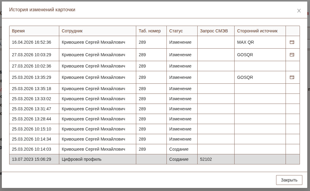 В истории изменения карточки будет отображаться информация о стороннем источнике на основании которого были изменены данные в карточке с возможностью перехода в карточку данных.