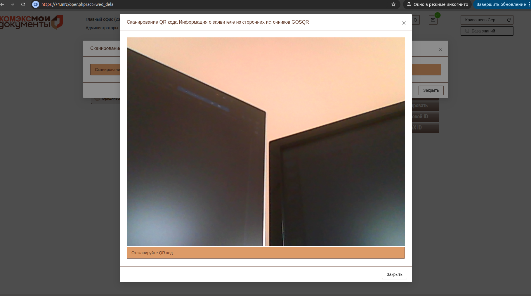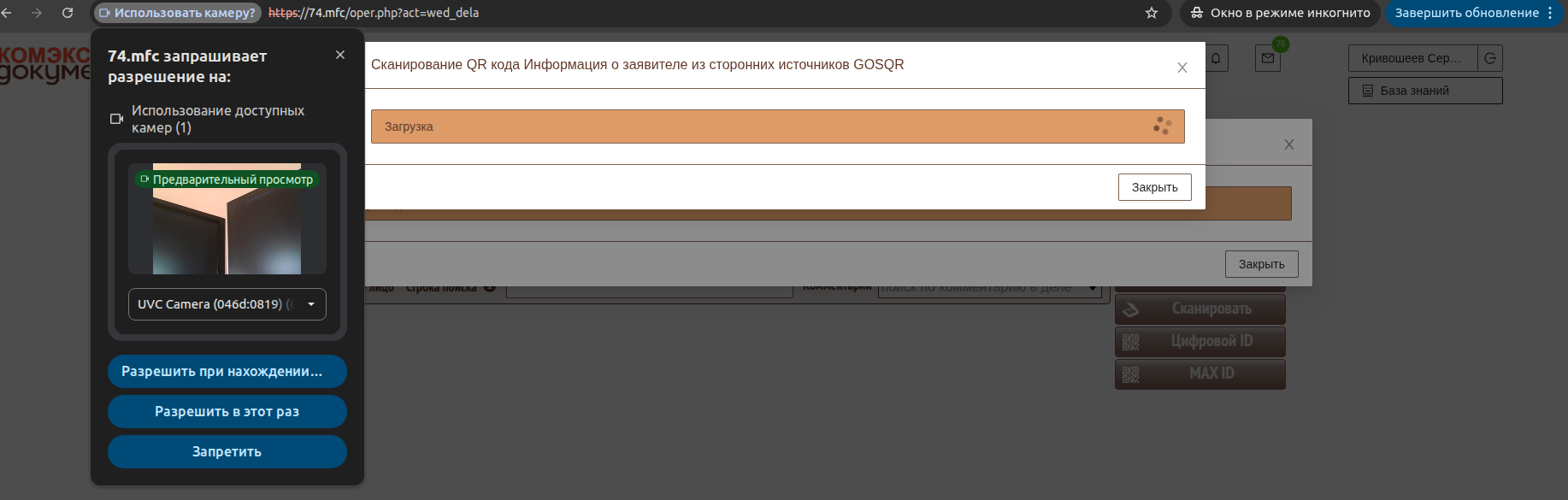 При открытии формы для сканирования QR кода система запросит доступ к WEB камере.