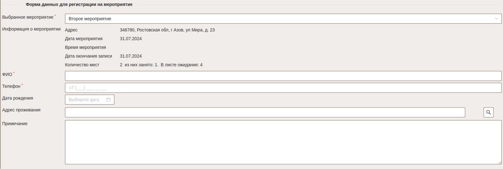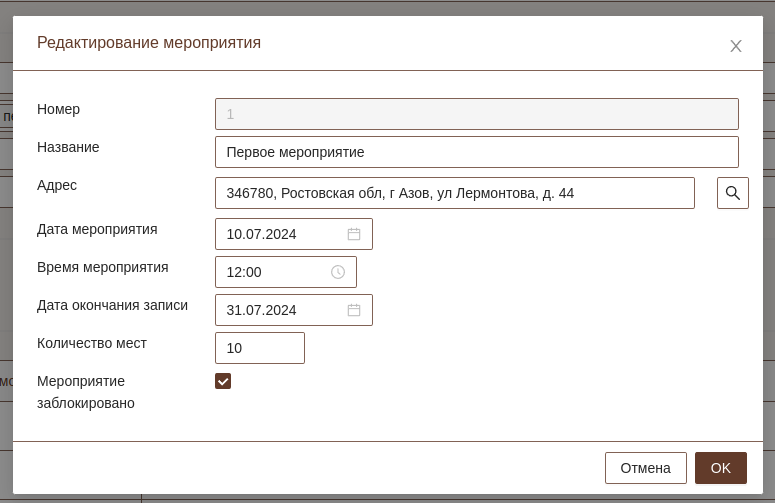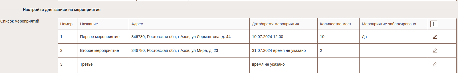 Для добавления необходимо указать уникальный номер мероприятия и его название. В т.ч. можно указать адрес и дату/время проведения мероприятия. Если количество мест ограничено, необходимо указать значение в полей "Количество мест". Место считается занятым, если у записи в реестре статус "Актуальная запись".