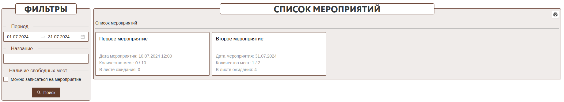 Данная форма показывать информацию о всех мероприятиях, позволяет фильтровать за период по названию и доступности записи. Признак возможности записи учитывает количество свободных мест и блокировку мероприятия.