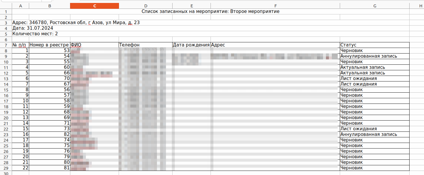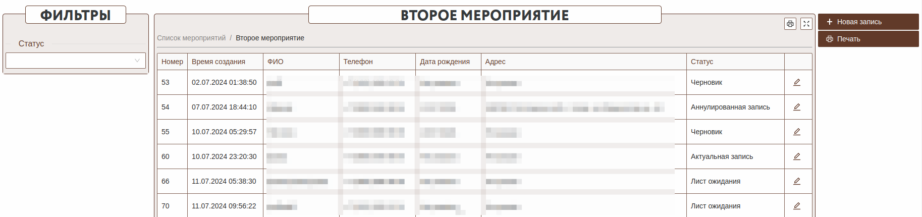 При выборе мероприятия оператор попадает в реестр записей, где можно посмотреть кто записан и какой статус его заявка в данный момент имеет.